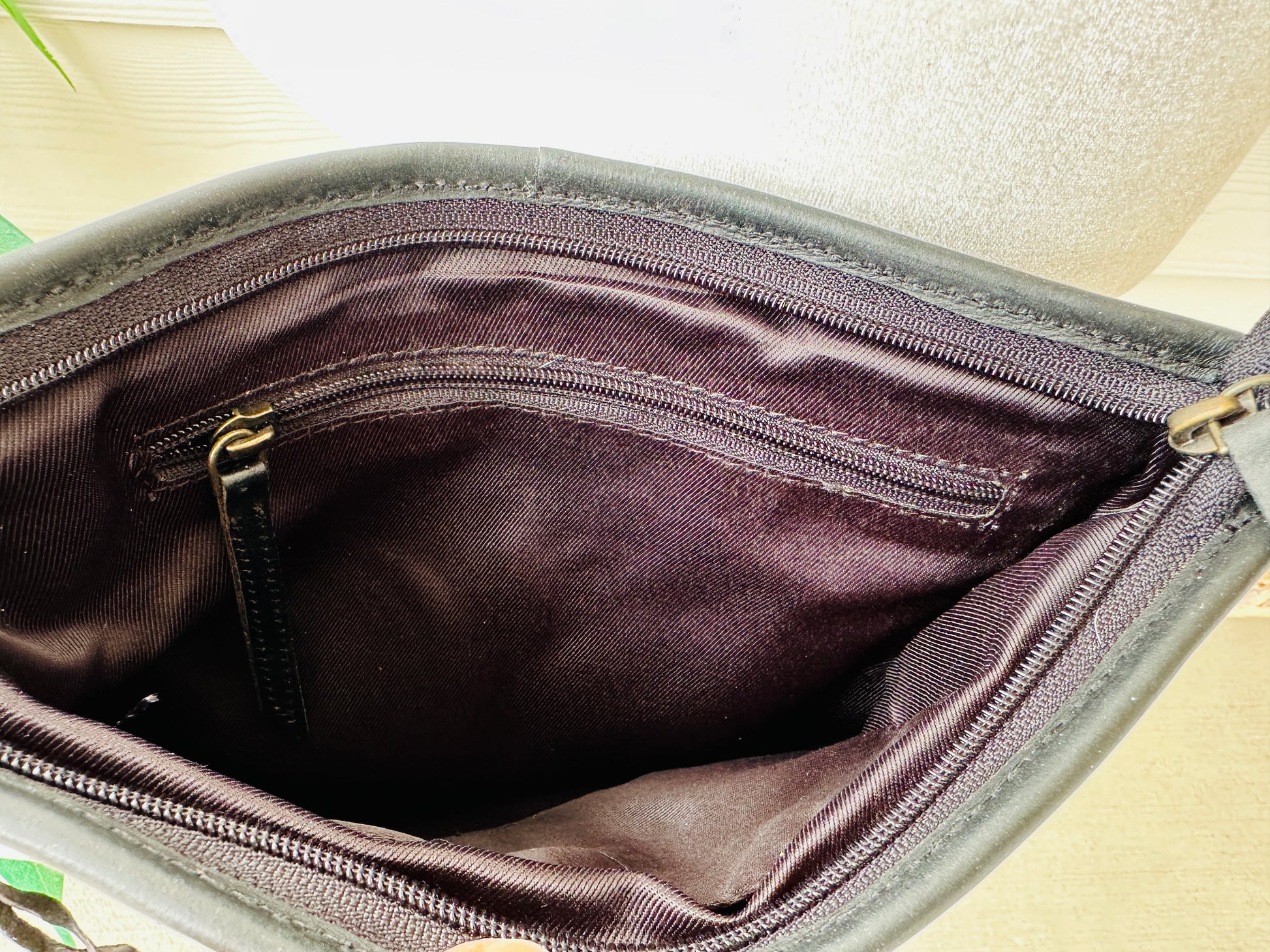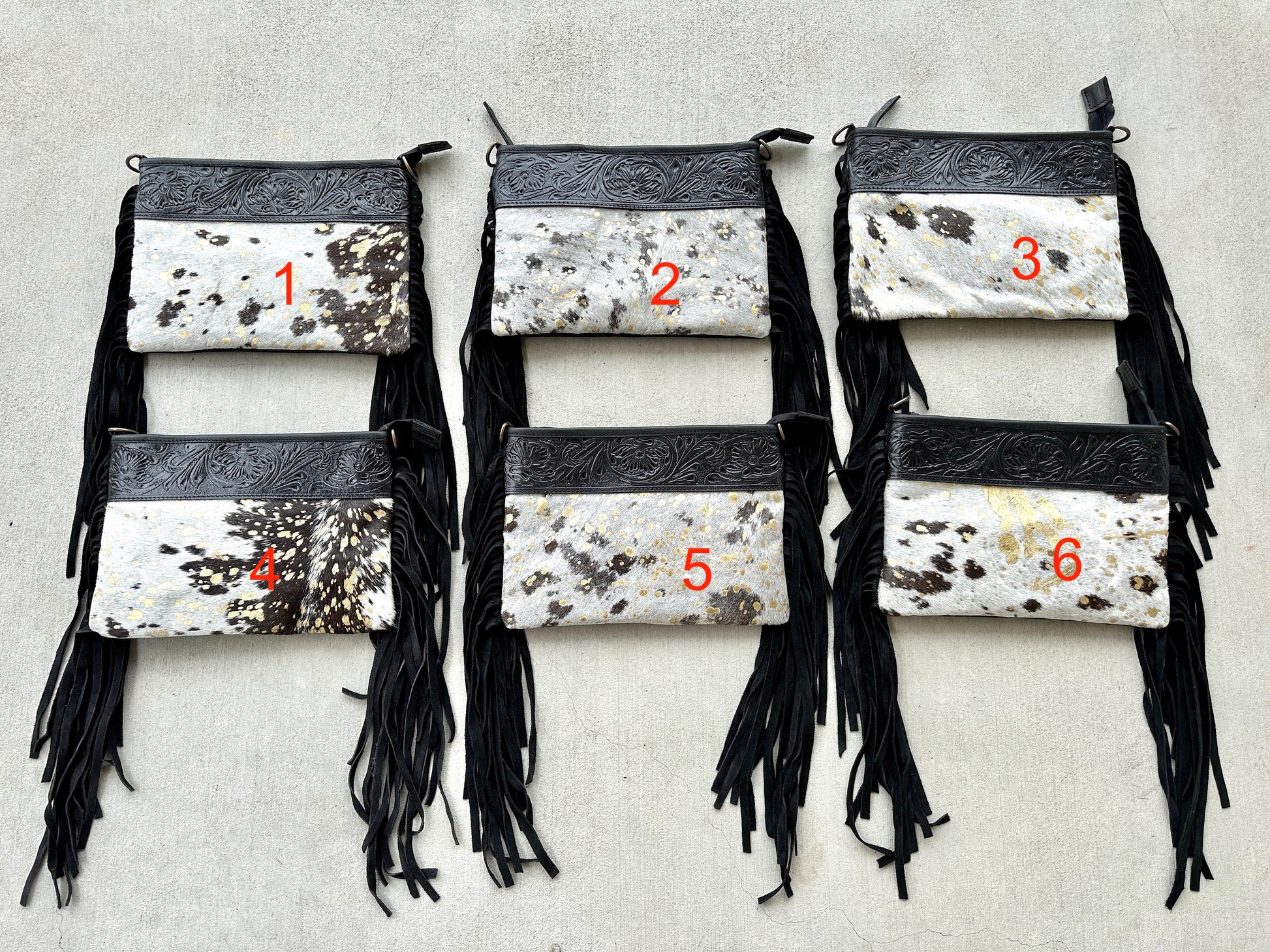 This listing is for genuine hair on cowhide crossbody purse with real black tooled leather details and gold acid wash accents. The bag features real tan leather back and suede leather fringes. It is a perfect purse that fits iPad, wallet, smartphone and much more.