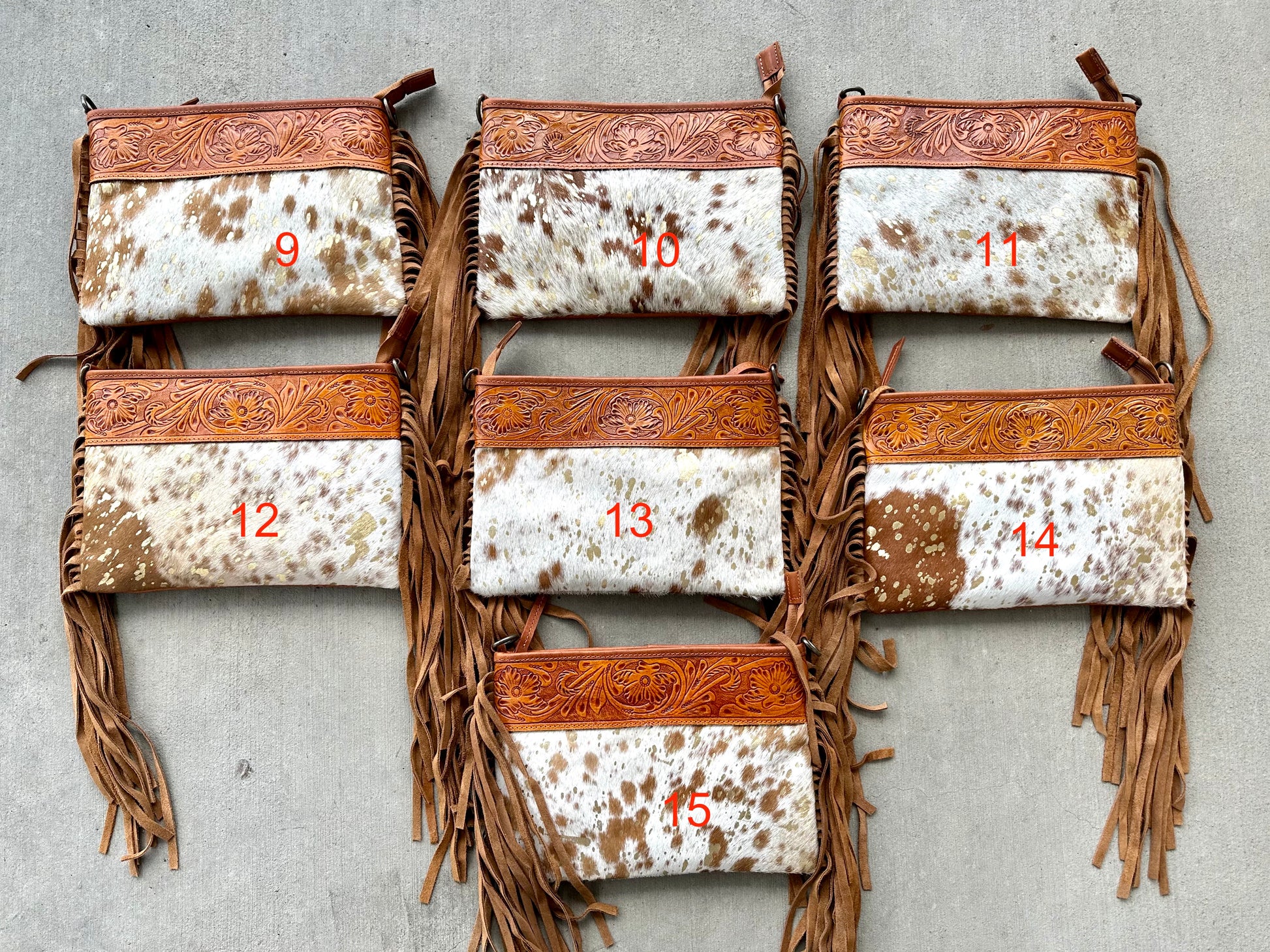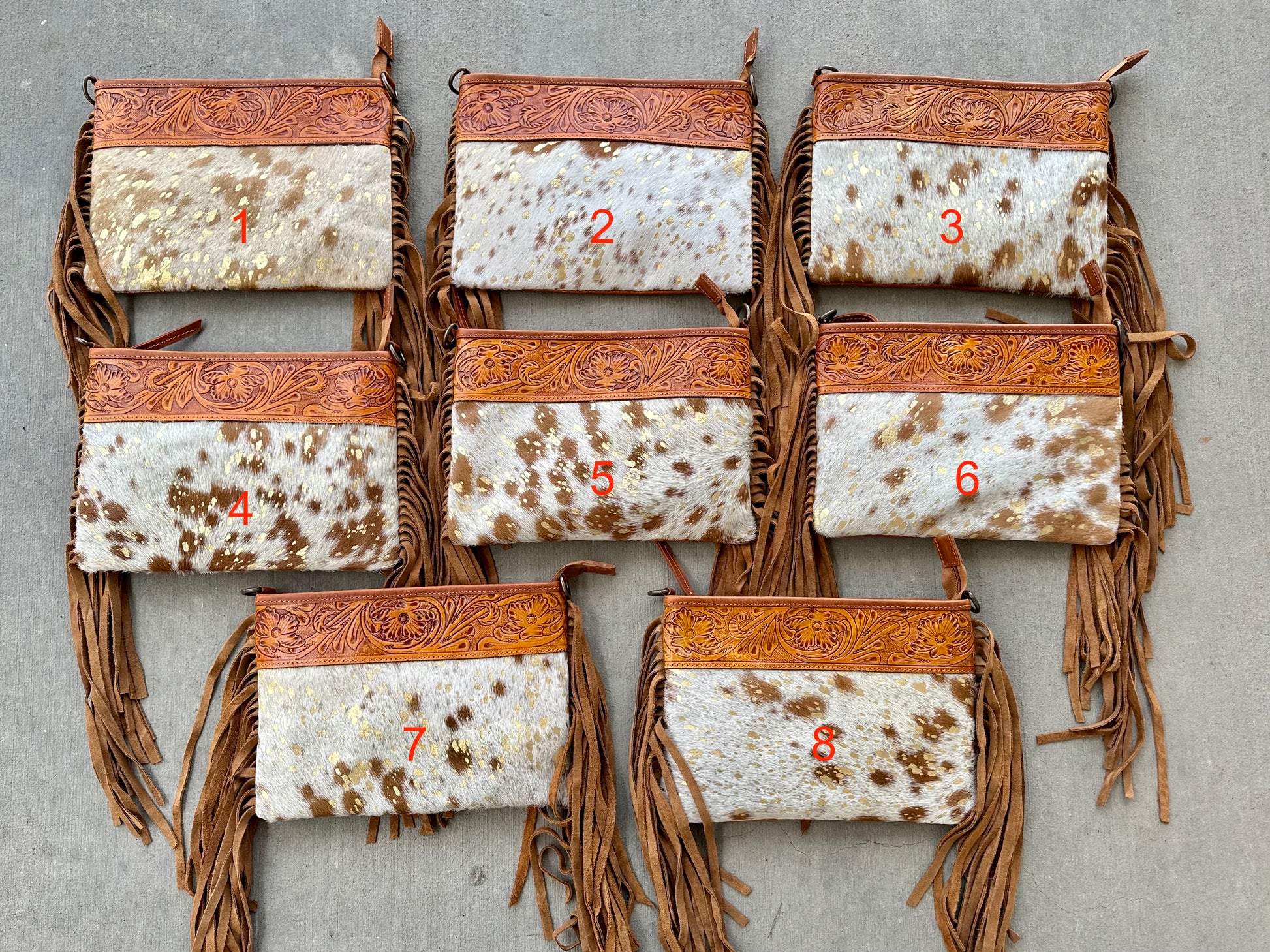 This listing is for genuine hair on cowhide crossbody purse with real tan tooled leather details and gold acid wash accents. The bag features real tan leather back and suede leather fringes. It is a perfect purse that fits iPad, wallet, smartphone and much more.