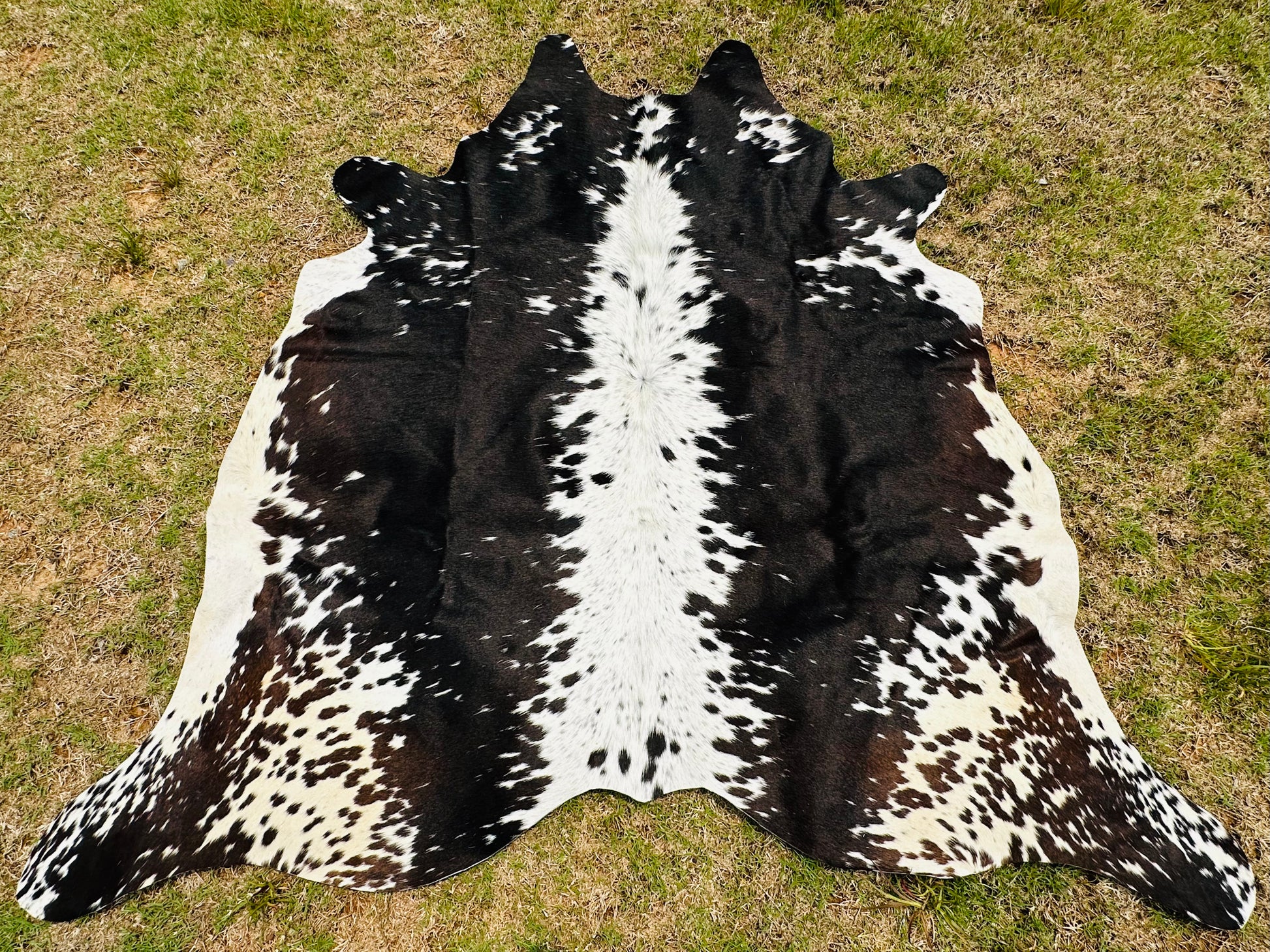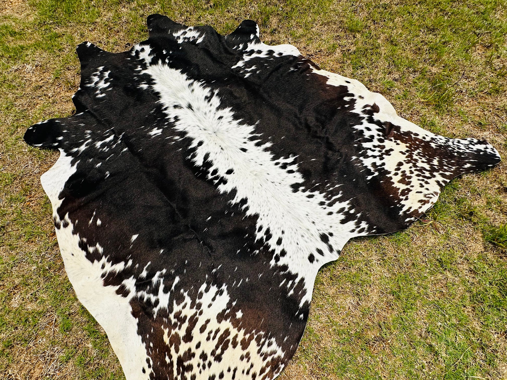 Elevate your space with this large 5 x 6 ft tricolor brown cowhide rug, blending natural Western charm with refined elegance. Its rich hues and unique pattern add warmth and texture, making it a striking centerpiece for any room. Perfect for enhancing rodeo-inspired or rustic decor with a sophisticated touch.